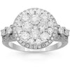 This glamorous womens diamond cocktail ring is handcrafted in lustrous 14k yellow gold. The center features round cut diamonds which are held by cluster setting. The center piece is surrounded by pave set round cut diamonds. The opposite sides of the band are prong and pave set with round cut diamonds. The center measures to 14 mm in diameter and the band weighs 4.4 grams. This beautifully designed cocktail ring is an ideal accessory which will guarantee any bystanders attention.