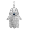 This pave set diamond hamsa pendant features 3 carats of VS clarity diamonds set in 19 grams of 14K solid yellow gold. The eye includes a brilliant round cut diamond with a bezel setting to complete the look. The pendant is 1.7 inches high including the bail, and 1 inch wide across the widest portion. Note: This chain is for illustration purposes only and may be purchased separately.
