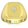 This uniquely designed mens diamond sapphire ring is crafted in 14K Yellow Gold. The center is bezel set with one large blue sapphire stone which is placed among two brilliant round cut diamonds. The frame measures to 5/16 Inches in width and weighs approximately 13.1 grams. Handmade to absolute perfection, this glamorous mens diamond pinky ring gleams with beauty and elegance.