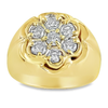 This uniquely designed mens diamond sapphire ring is crafted in 14K Yellow Gold. The center is bezel set with one large blue sapphire stone which is placed among two brilliant round cut diamonds. The frame measures to 5/16 Inches in width and weighs approximately 13.1 grams. Handmade to absolute perfection, this glamorous mens diamond pinky ring gleams with beauty and elegance.