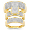 Gleaming in absolute elegance, this uniquely designed diamond wedding band set is crafted in 10K Yellow Gold. The engagement ring is pave set with brilliant small round cut diamonds and comes with a matching womens diamond wedding band which measures to 3/16 Inches in width. The bridal ring set comes with an additional mens diamond wedding band which is also pave set with numerous small round cut diamonds and measures to 3/16 Inches in width. Weighing approximately 5.7 grams, this lovely diamond three ring wedding band set is an ideal gift for him and her.