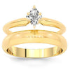 This exquisite diamond bridal ring set is crafted in highly polished 14K Yellow Gold. The engagement ring is prong set with one brilliant marquise cut diamond which totals to 0.25 carats. The ring comes with a matching gold wedding band which measures to 3/16 Inches in width. Weighing approximately 5.5 grams, this diamond bridal ring set is an ideal gift for both occasions.