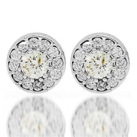 These glamorous stud earrings are handcrafted in lustrous 14K white gold. The center of both earrings are set with brilliant clarity enhanced diamonds which weigh 2.07 ctw. The side stones which surround the center stones are pave set all the way around and total to additional 1.01 carats, Weighing 7 grams, these beautiful stud earrings are ideal for an every day or special wear.